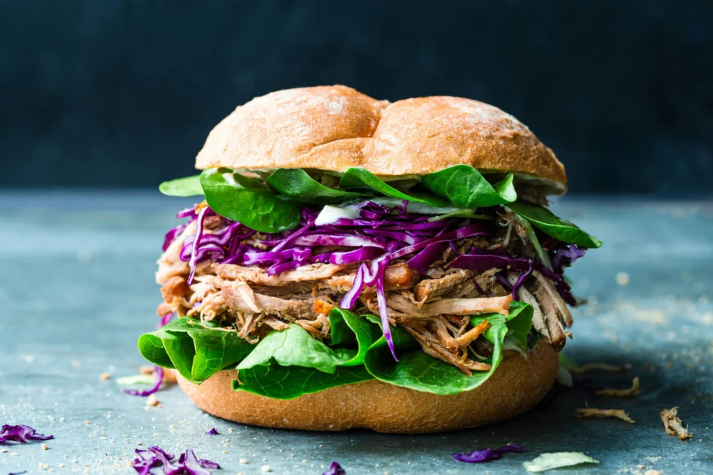 Instructions: Mix brown sugar and spices together, then rub all over the pork shoulder. Put the pork in the slow cooker, pour broth around it (not over it—you want the rub to stay on). Cook on low for 8-10 hours or high for 5-6 hours until the meat shreds easily with a fork. Remove pork, shred it, and discard any big chunks of fat. Return shredded pork to the slow cooker, mix in BBQ sauce, and let it sit on warm for another 30 minutes so the sauce soaks in. Serve on slider buns with coleslaw or cabbage and lettuce on top.